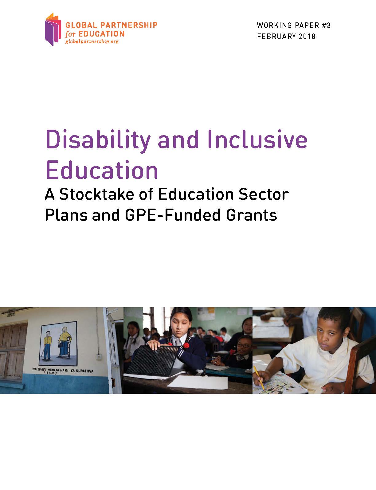 This report documents progress and highlights the need to step up support to GPE partner countries on disability and inclusive education, to improve consideration of issues around disability and inclusion in education sector analysis and sector planning processes to better promote the achievement of GPE 2020 strategic goal 2, and to fulfill the transformative vision of Agenda 2030. This means ensuring that girls and boys with disabilities are not only able to access their right to a quality education in a nurturing environment, but also, through education, become empowered to participate fully in society, and enjoy full realization of their rights and capabilities.