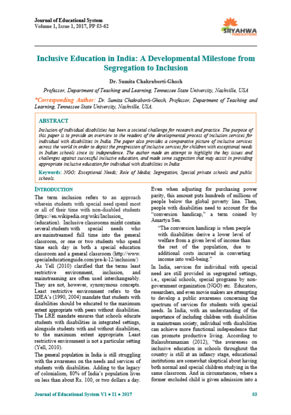 Inclusive Education in India: A Developmental Milestone from Segregation to Inclusion